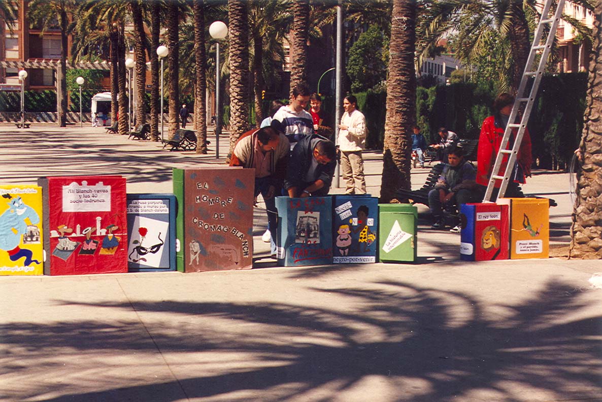 23 d'abril de 1995. Pancarta a la Plaça Trafalgar reivindicant una biblioteca pública per al barri.