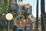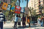 23 d'abril de 1995. Penjada de la pancarta a la plaça Trafalgar.