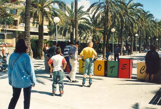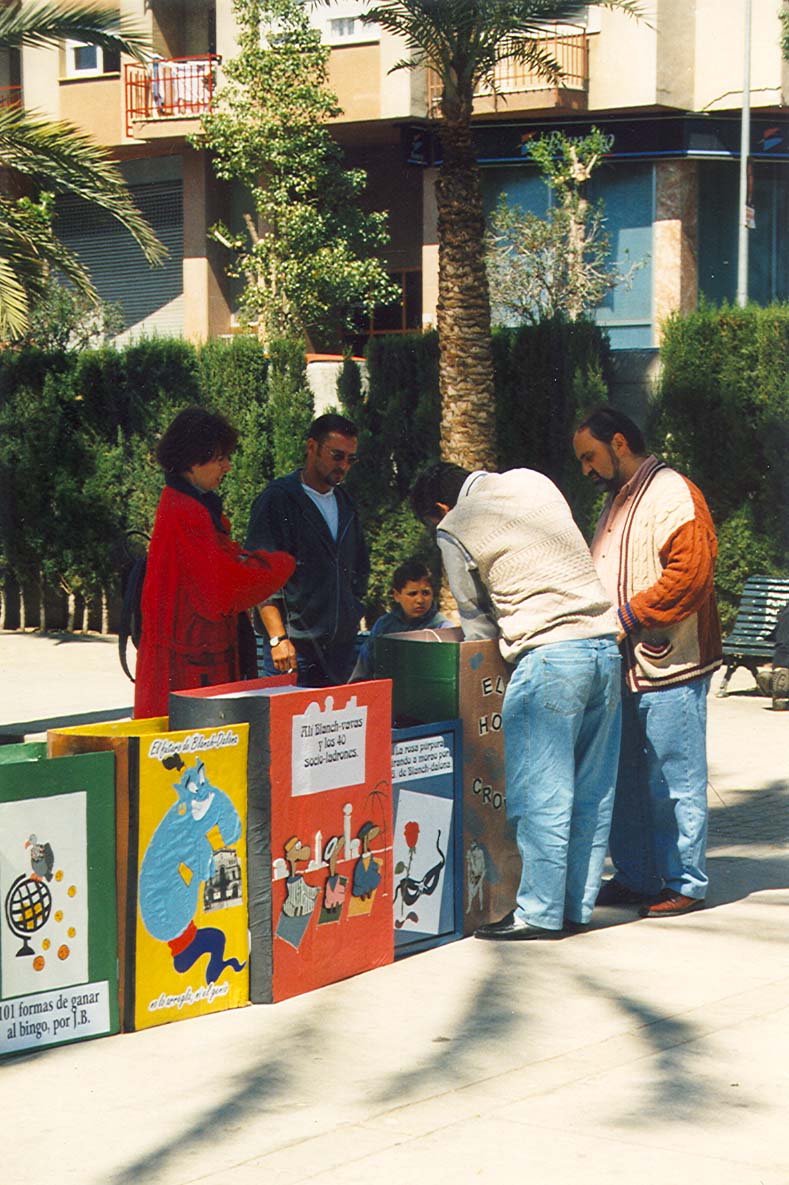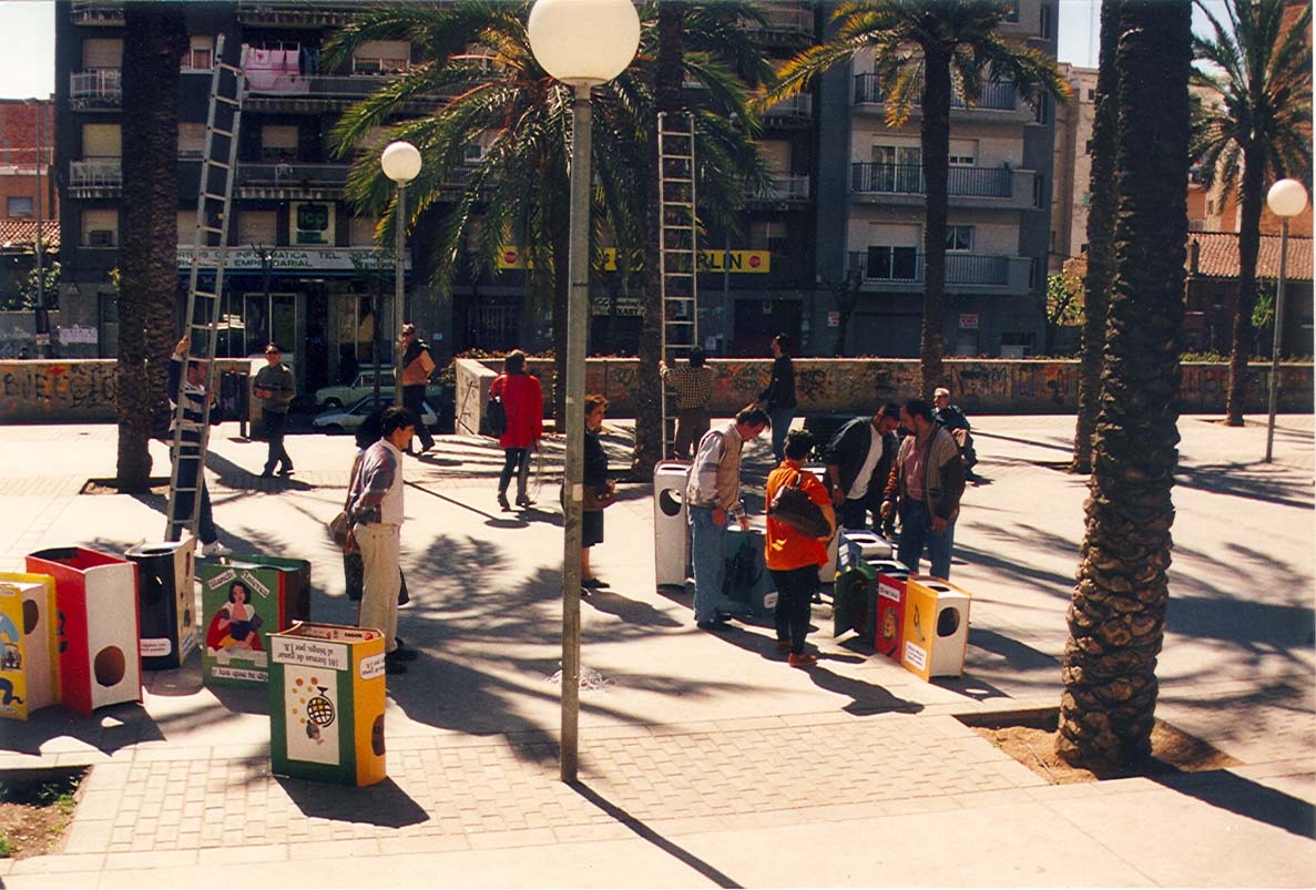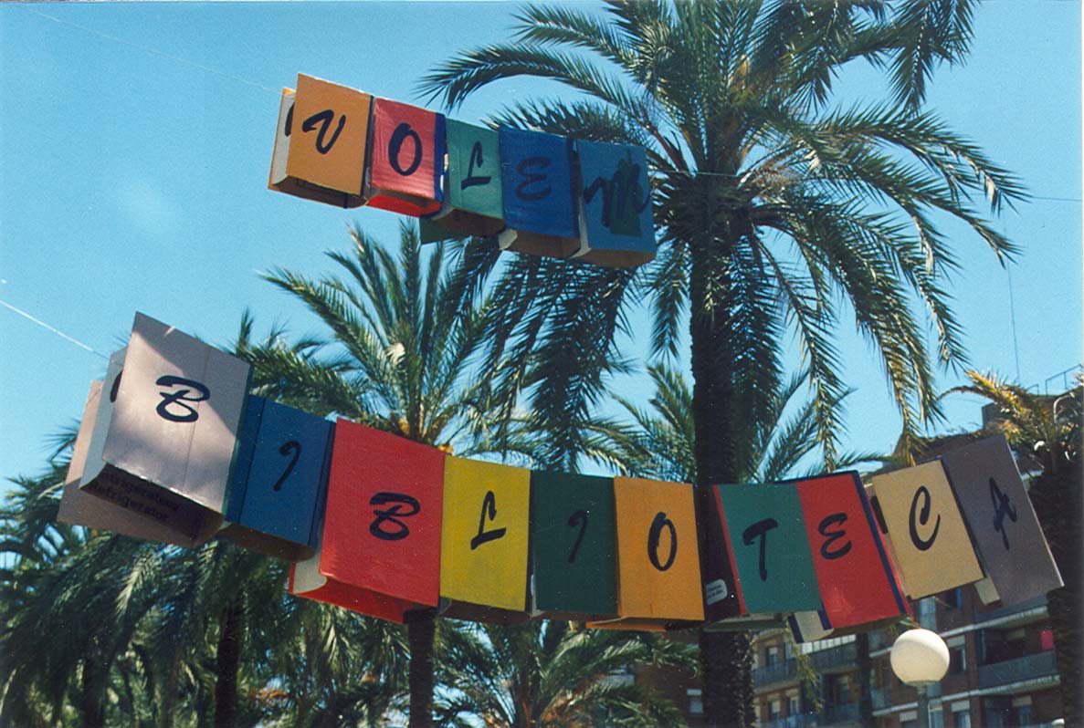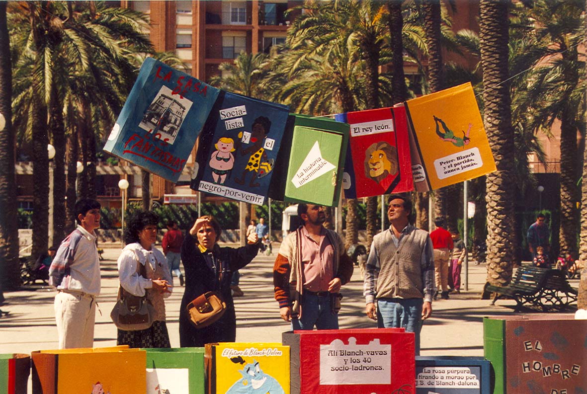 23 d'abril de 1995. Pancarta a la Plaça Trafalgar reivindicant una biblioteca pública per al barri.