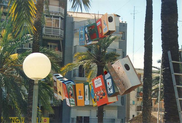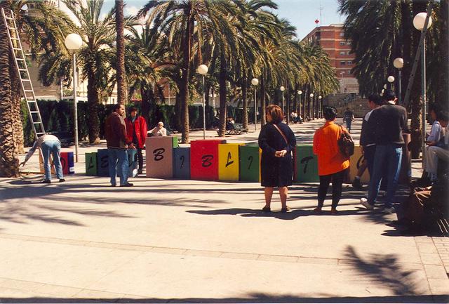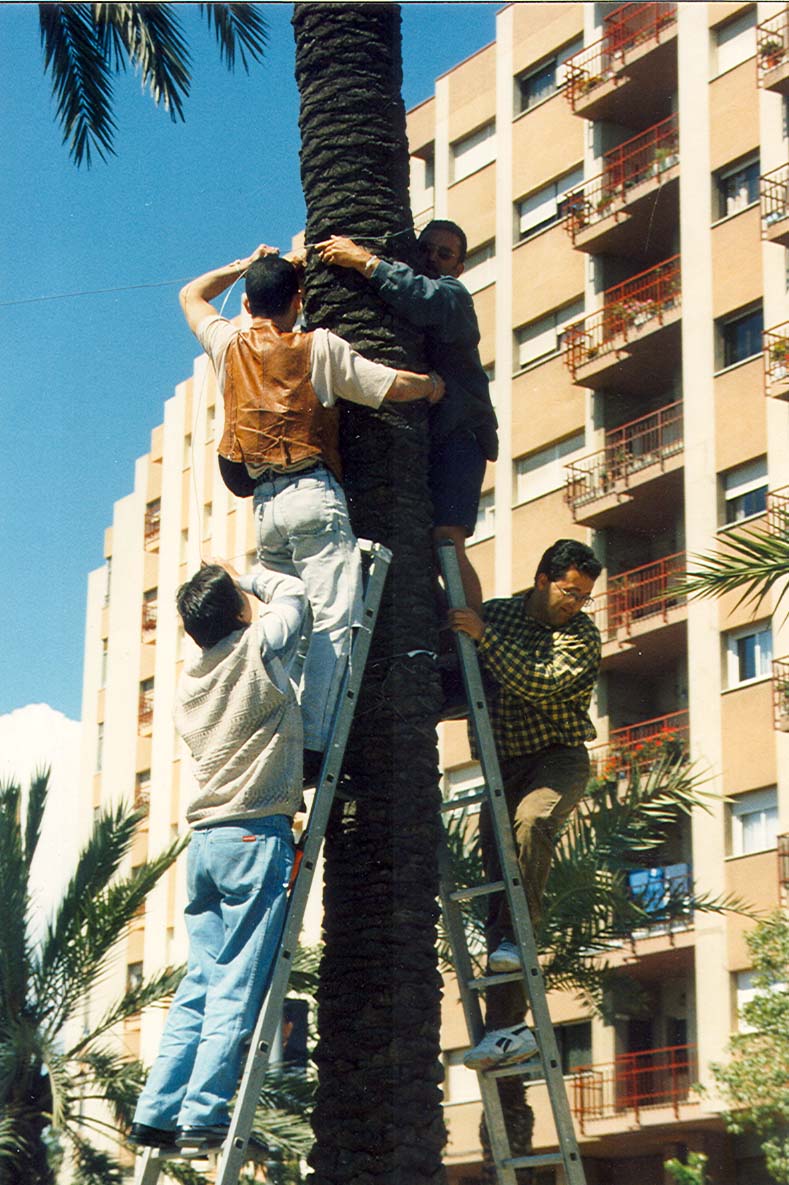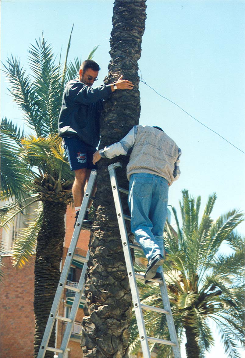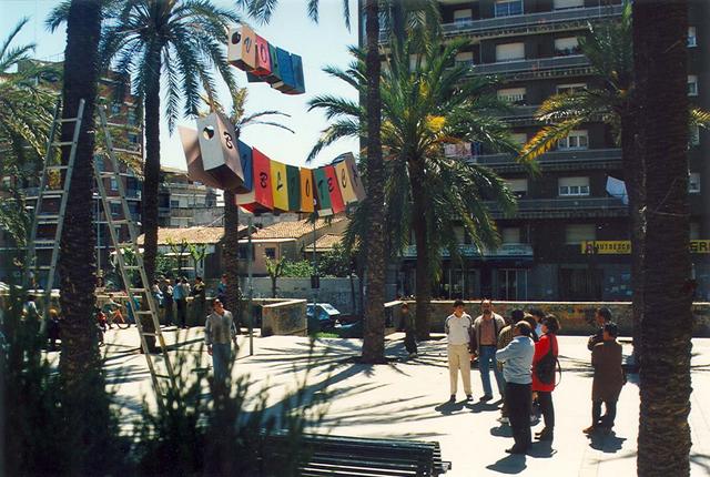 23 d'abril de 1995. Penjada de la pancarta a la plaça Trafalgar.