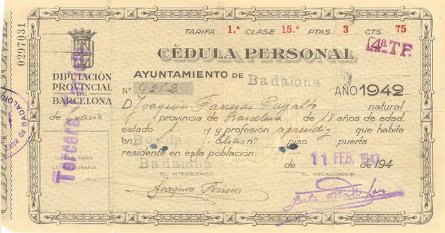 1942 Cèdula personal del Sr. Ferreres