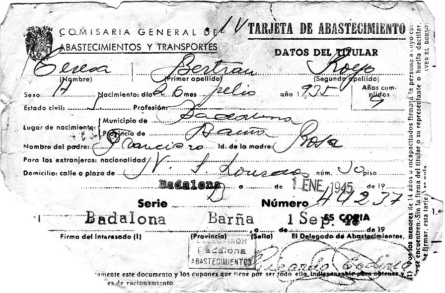 Targeta d'avituallament de Teresa Bertrán Royo. Fons Teresa Bertrán Royo.