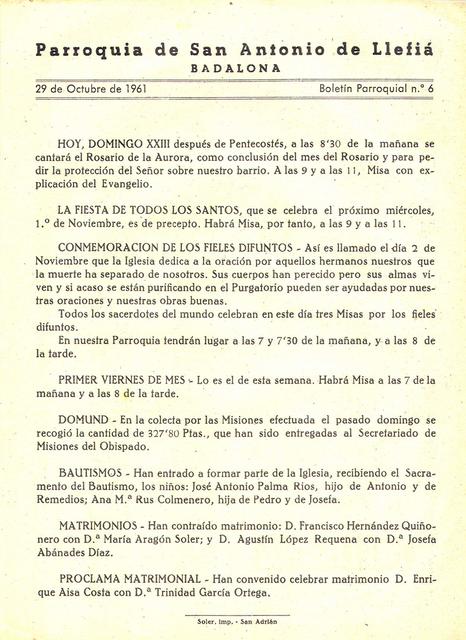 1961 Boletin parroquial núm 06