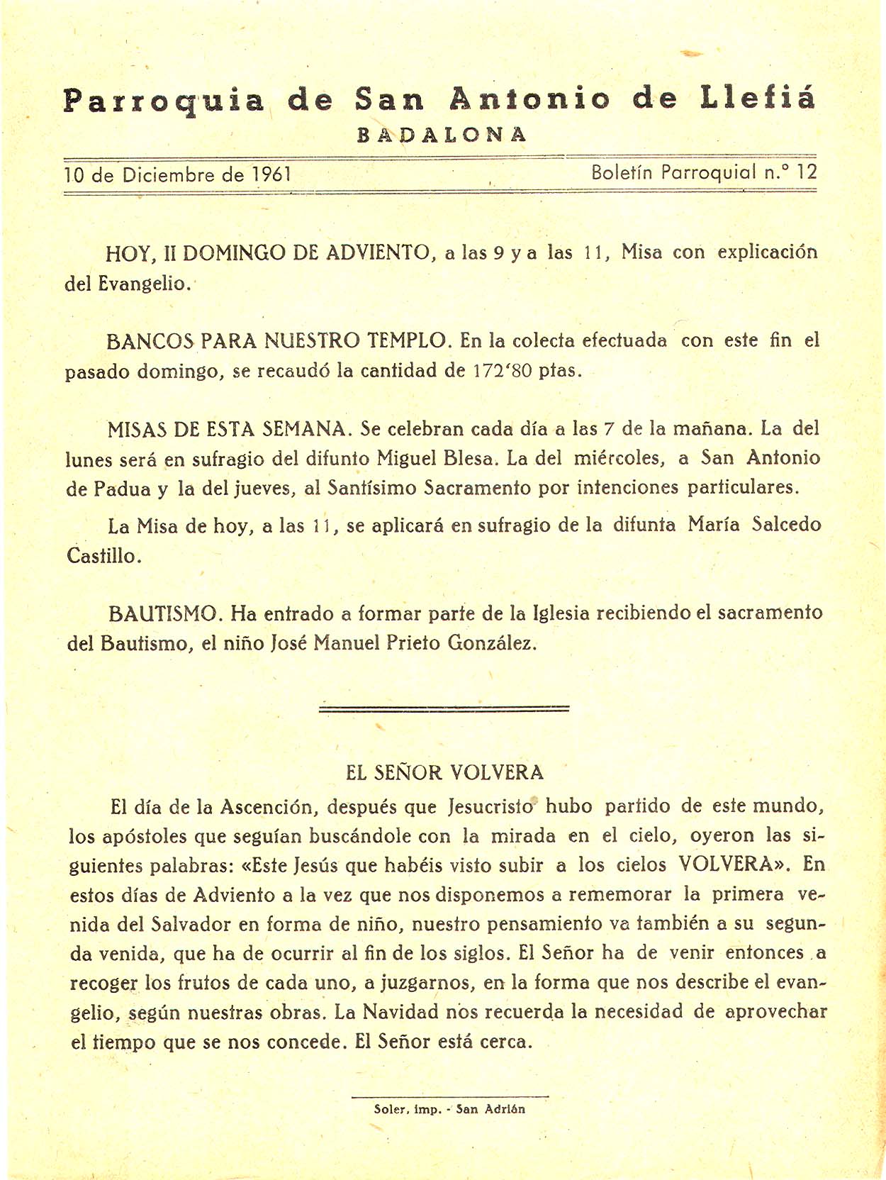 1961 Boletin parroquial núm 12
