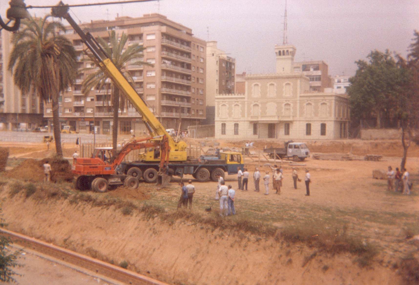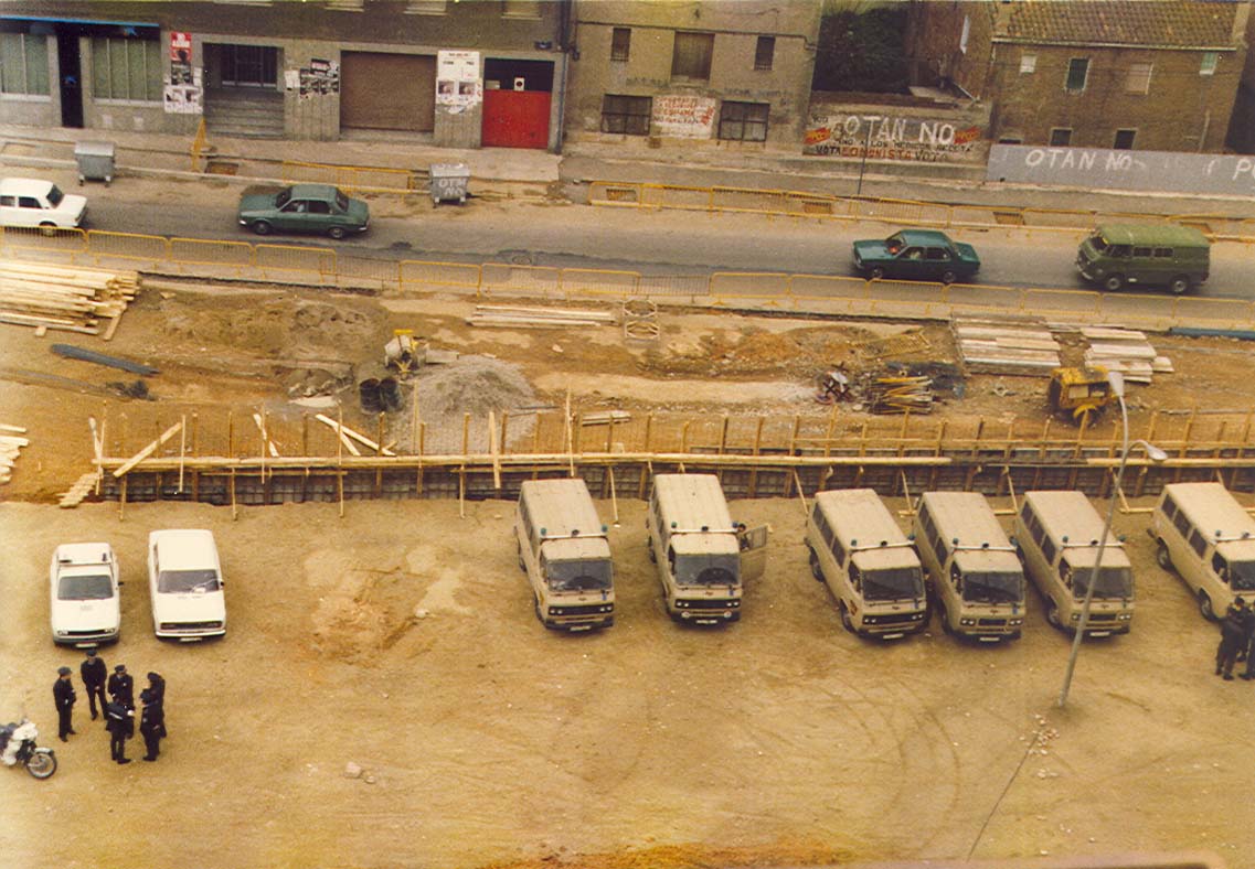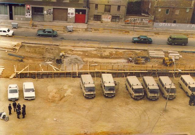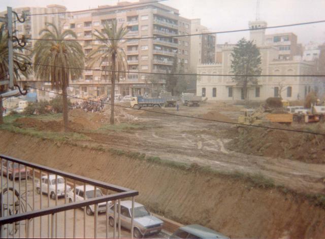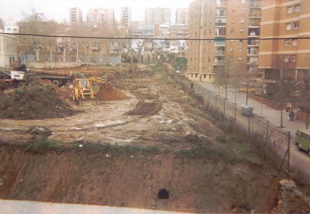 1986. Plaça Trafalgar. Fons: Sra. Clarà Data: 21/06/05 Obres als terrenys de Torre Mena per a la construcció de la plaça Trafalgar i l'ambulatori.