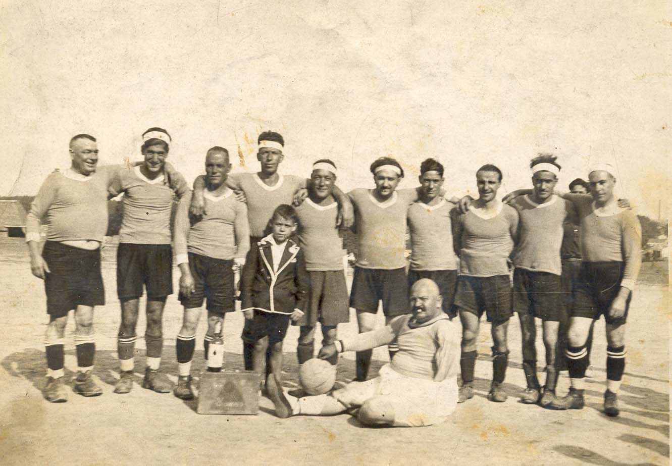 1935. Equip de futbol. Fons: Teresa Bertrán. Data: 21/06/05 Equip de futbol format per veïns del barri. S'entrenaven en els terrenys on avui hi ha els blocs Verge Assumpta, l'any 1934-35. El porter és l'home manc.