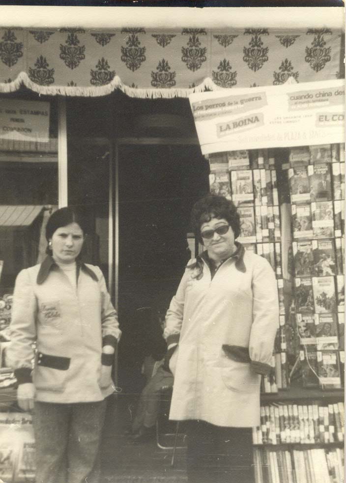 1974 Llibreria Julieta. Fons: Encarna Mejías Data: 21/06/05 Fotografia presa el 23 d'abril de 1974. Llibreria situada al carrer Pérez Galdós. A l'esquerra Encarna Mejías i a la dreta Sra. Julieta.