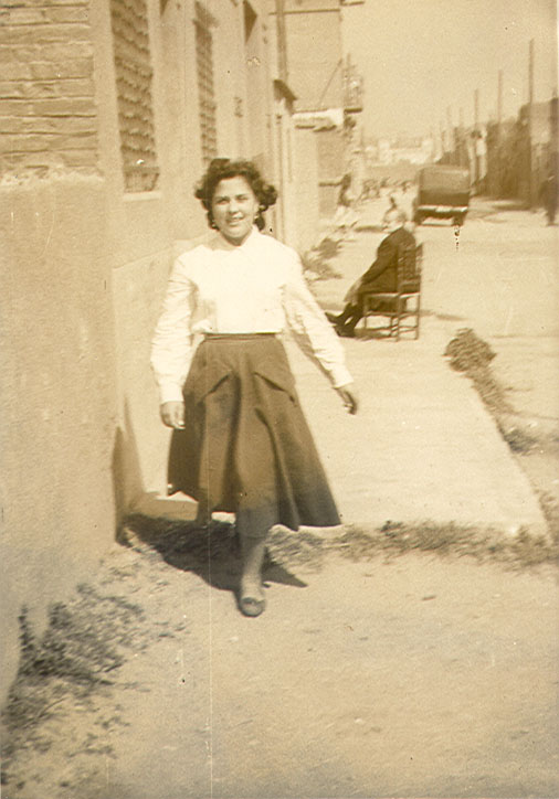 1953. Carrer Europa. Fons: María López "Maruja" Data: 31/10/08 1953. A la fotografia María López al costat de casa seva al carrer Europa coneguda com "la casa de la gallina Anita".