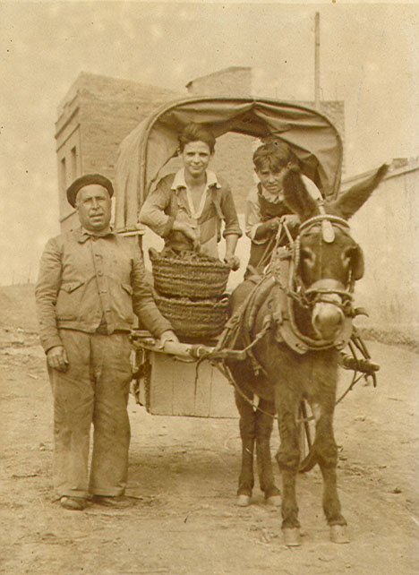 1953. Carboner. Fons: Francisco Aroca Delegido Data: 10/11/08 El sr. Francisco Alvarez, carboner de Llefià , amb dos nois del barri que l'ajudaven repartint el carbó per les cases.