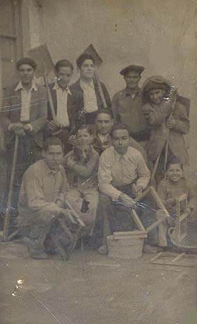 1943. Treballadors de la bòbila Joan Elias. Fons: família Ferreres Data: 21/06/05 7 de març de 1943.Treballadors de la bòbila d'en Joan Elias amb diferents eines a les seves mans. D'esquerra a dreta començant des de dalt: en Vicenç, desconegut, en Jaume, en Lluís Ferreres Montroig, en Rafalet. A primera fila: desconegut, en Carlos Ferreres Pelegrín, en Salvador, en Joaquim Ferreres Puyalto i en Jaume Ferreres Pelegrín.