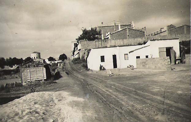 Carrer París mirant cap a Sant Adrià. Al fons es veu la cúpula de l'església de Sant Adrià. A la casa blanca (propietat de la bòbila de Joan Elias) hi vivia la família Ferreres.