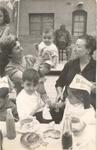 Xocolatada al carrer Mare de Déu de Lorda durant la Festa Major de Sant Antoni. A primer terme els germans Josep i Gisela Valero Bertrán. Darrere d'esquerra a dreta Sra. Magdalena Ibáñez, Mónica Andreu (néta de la Sra. Magdalena), Vicenta Royo. Any 1964.