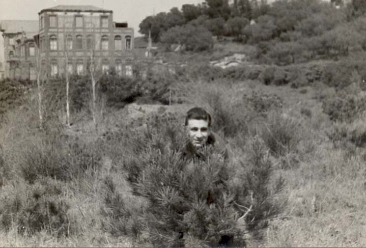 Any 1959/60. Camp de blat situat als terrenys de l'actual plaça Dalí. En primer pla, Genís Rosa Martínez i al fons l'Hospital de l'Esperit Sant.