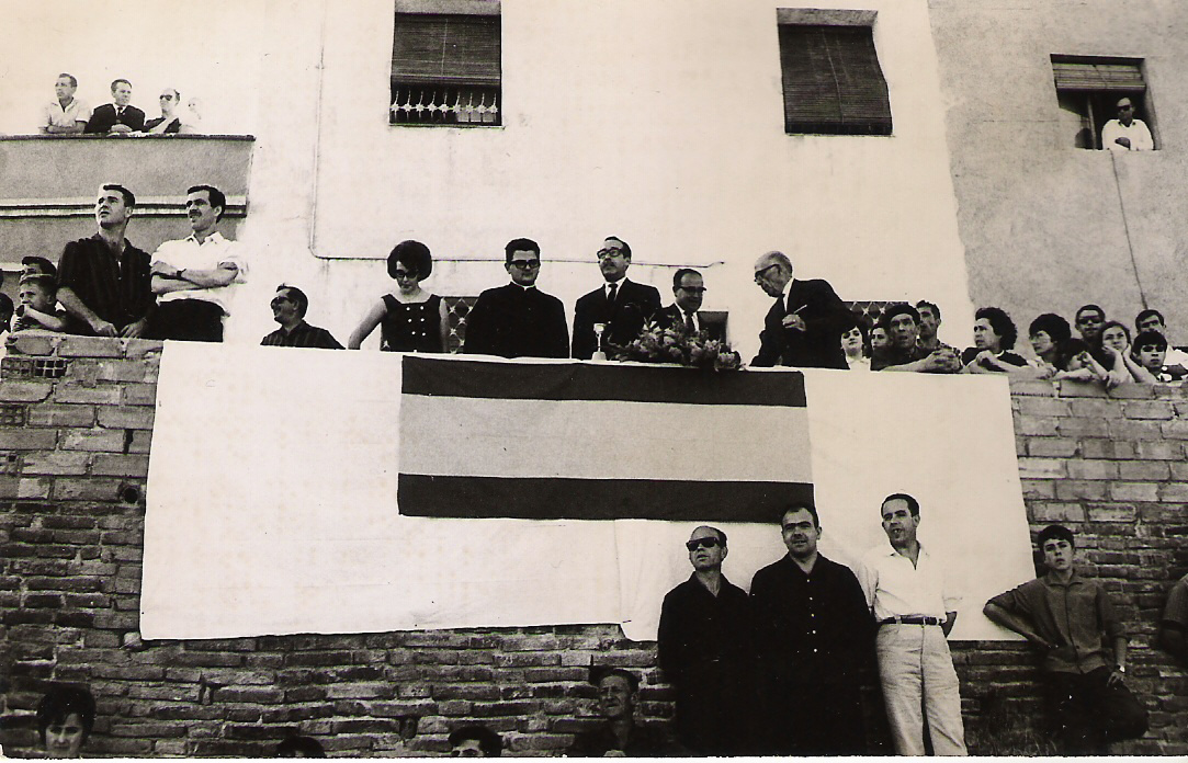 1961.Inaguració camp de futbol Verge Assumpta. Fons: Montserrat Viles Data: 17/10/09 Inaguració del camp de futbol Verge Assumpta, autoritats: mossèn Carreras; Sr. Viles, president del Llefià; Sr. Conesa, president de l'associació de veïns; Sr. Rizo, alcalde del barri.