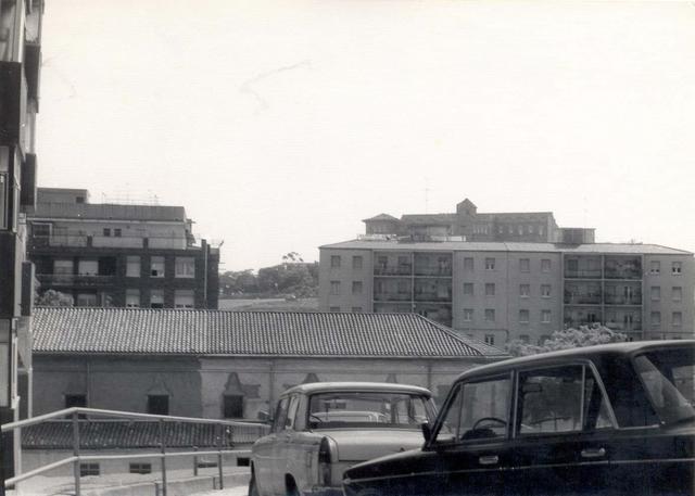 Vista parcial dels dos blocs d'habitatges patrocinats per la cooperativa de la parròquia a la plaça Azorín, l'any 1967. En primer lloc la teulada de l'església.