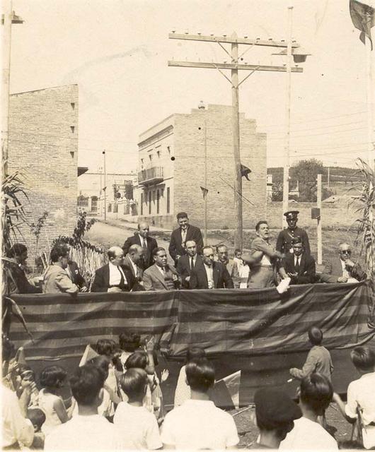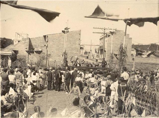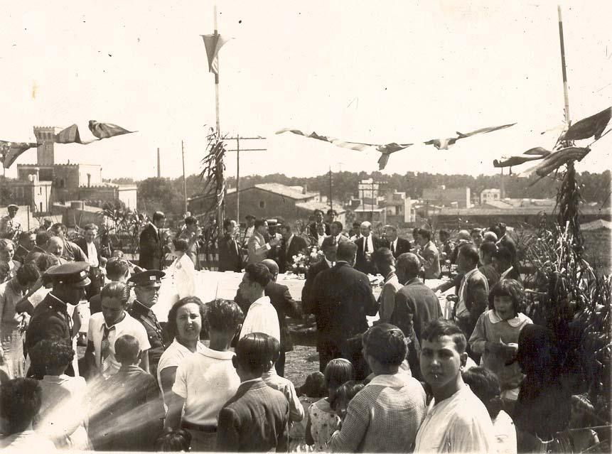 Refrigeri per als assistents a l'acte. Fotografia presa al carrer Pérez Galdós cantonada Europa. Al fons a l'esquerra es veu la Torre Mena i a continuació Can Batllori. Els arbres del fons de la imatge són la carretera de Mataró (l'actual Av. Marquès de Mont-roig).