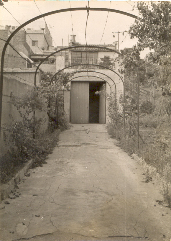 Porta del garatge-capella en el jardí de la família Escarrabill, al carrer Mare de Déu de Lorda, entre el carrer La Pau i Vistamar. En aquest garatge es van celebraron les primeras misses davant de la construcció de la capella i després posterior església de Sant Antoni de Pàdua.