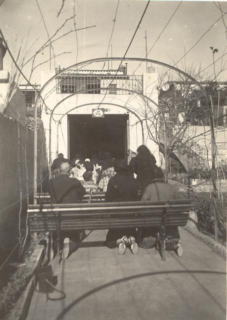 Missa celebrada l'any 1934 en el garatge-capella en el jardí de la família Escarrabill, al carrer Mare de Déu de Lorda.