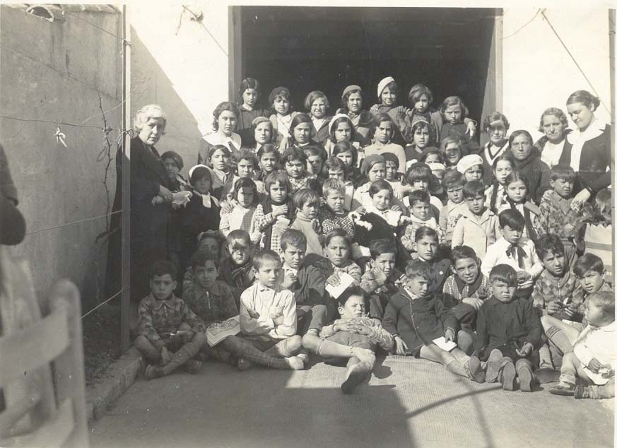 1934. Grup de catequesi. Data: 28/06/05 Primer grup de nens de catequesi. Fotografia feta davant la porta del garatge-capella al jardí de la família Escarrabill, carrer Mare de Déu de Lorda, entre La Pau i Vistamar.