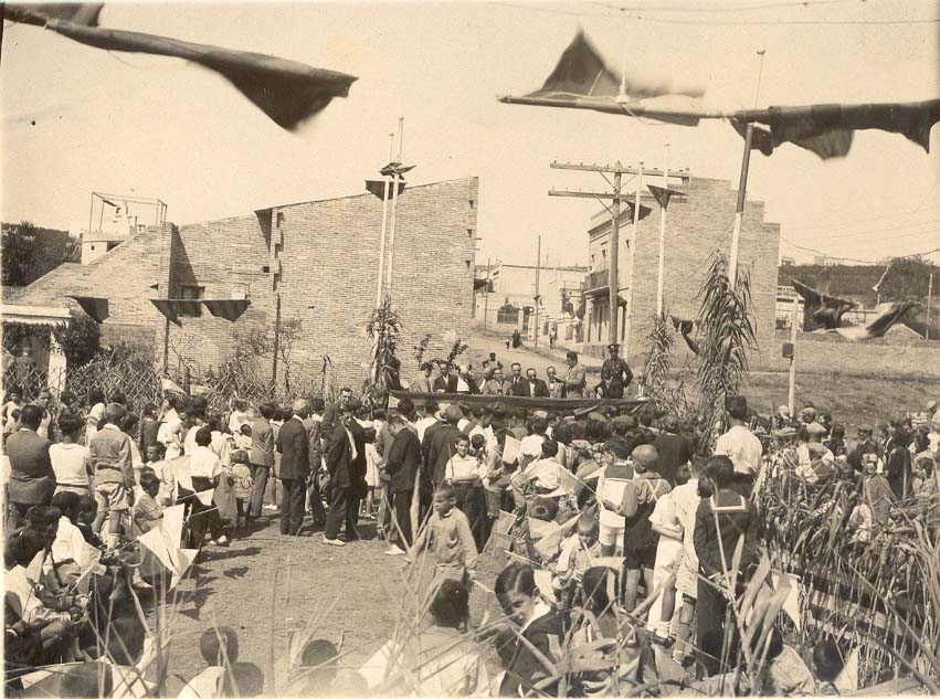 1934. Festa de l'arbre Data: 28/06/05 Festa de l'arbre organitzada per l'Associació de propietaris i veïns de Llefià-Puigfred. A la fotografia, presa al carrer Pérez Galdós amb Europa, està parlant el Secretari de l'entitat, el Sr. Gras. La primera casa a l'esquerra és l'actual farmàcia. Fons: Parròquia