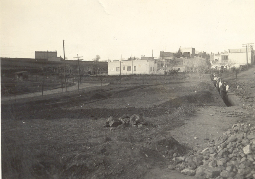 1935 Fent els fonaments de la capella. Data: 28/06/05 Primeres obres de la parròquia, realització dels fonaments de la capella.