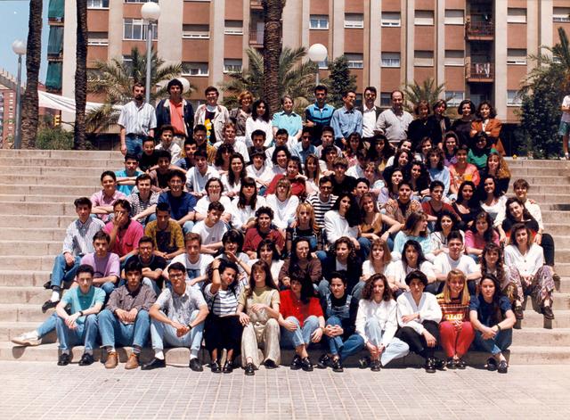 Promoció del curs 1990-1991 de l'IES Badalona VIII (antiga extensió de l'IES Eugeni d'Ors, i futur IES Barres i Ones). Primera promoció de COU de l'institut. Foto feta pocs mesos després de la inauguració del nou edifici de l'institut a la carretera antiga de València (primer institut públic inaugurat a Llefià; l'antic edifici es trobava situat al barri del Remei).