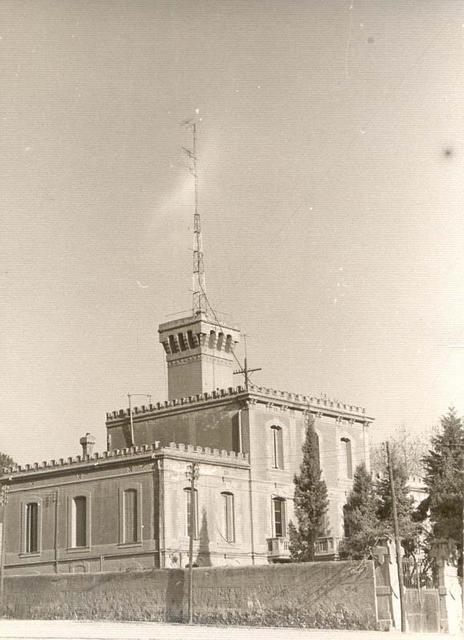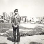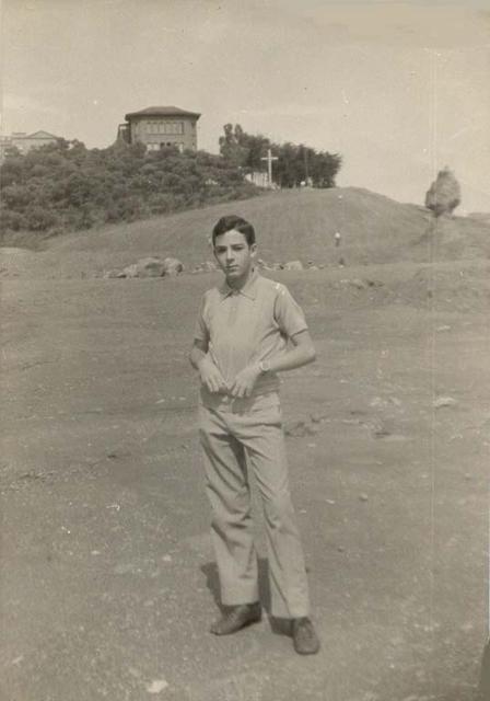 Fotografia presa a l'alçada de l'actual plaça Dalí. A primer terme Lluís Ferreres Montroig. Al fons es veu l'edifici de l'Esperit Sant amb la pineda, també s'observa la Creu i el turó on hi havia una fita que marcava el límit entre Badalona i Santa Coloma de Gramenet, aquesta fita queda elevada a causa de l'extracció de terra per a la construcció de l'Autopista.