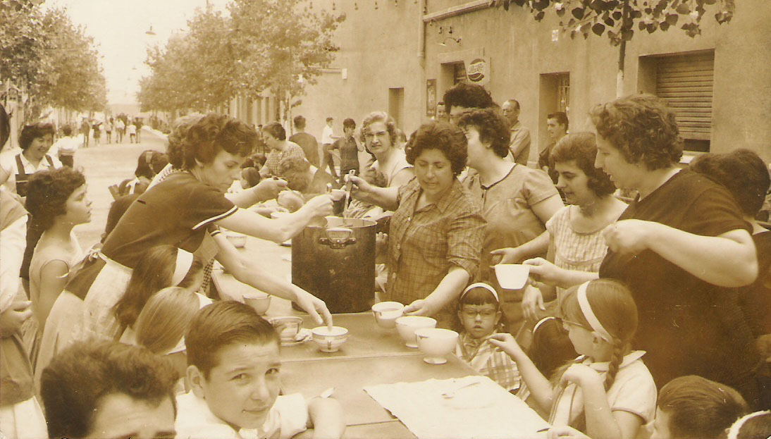 Xocolatada al carrer Europa durant les Festes de Sant Antoni, l'any 1970.