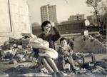 1966. Torre Hospital. Fons: Isabel i Angel Pérez Data: 21/06/05 A primer terme Isabel Pérez amb Carlota i David Pérez a les ruïnes de part de la Torre Hospital. Al fons edificis de Sant Roc.