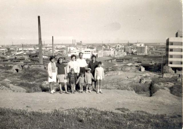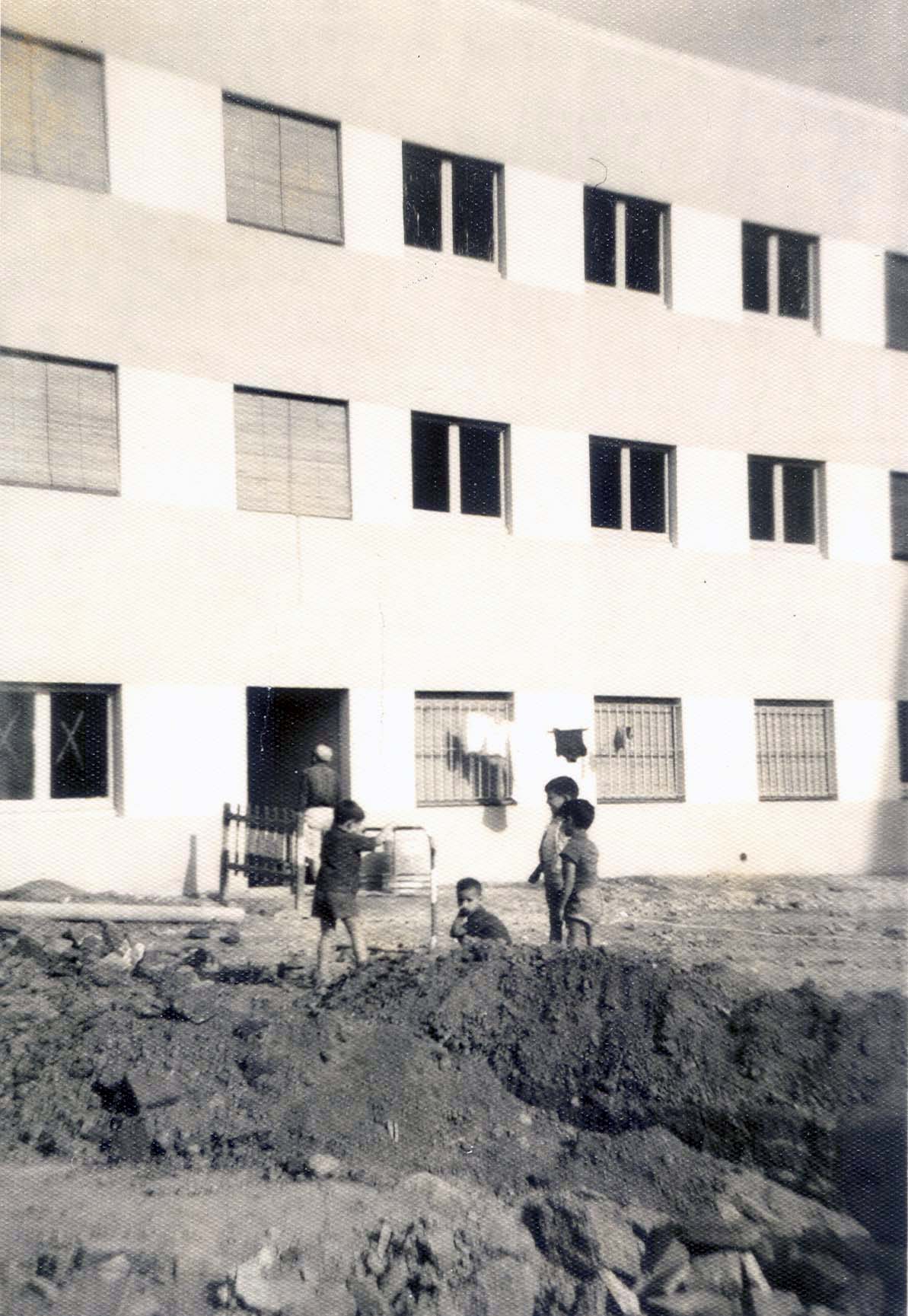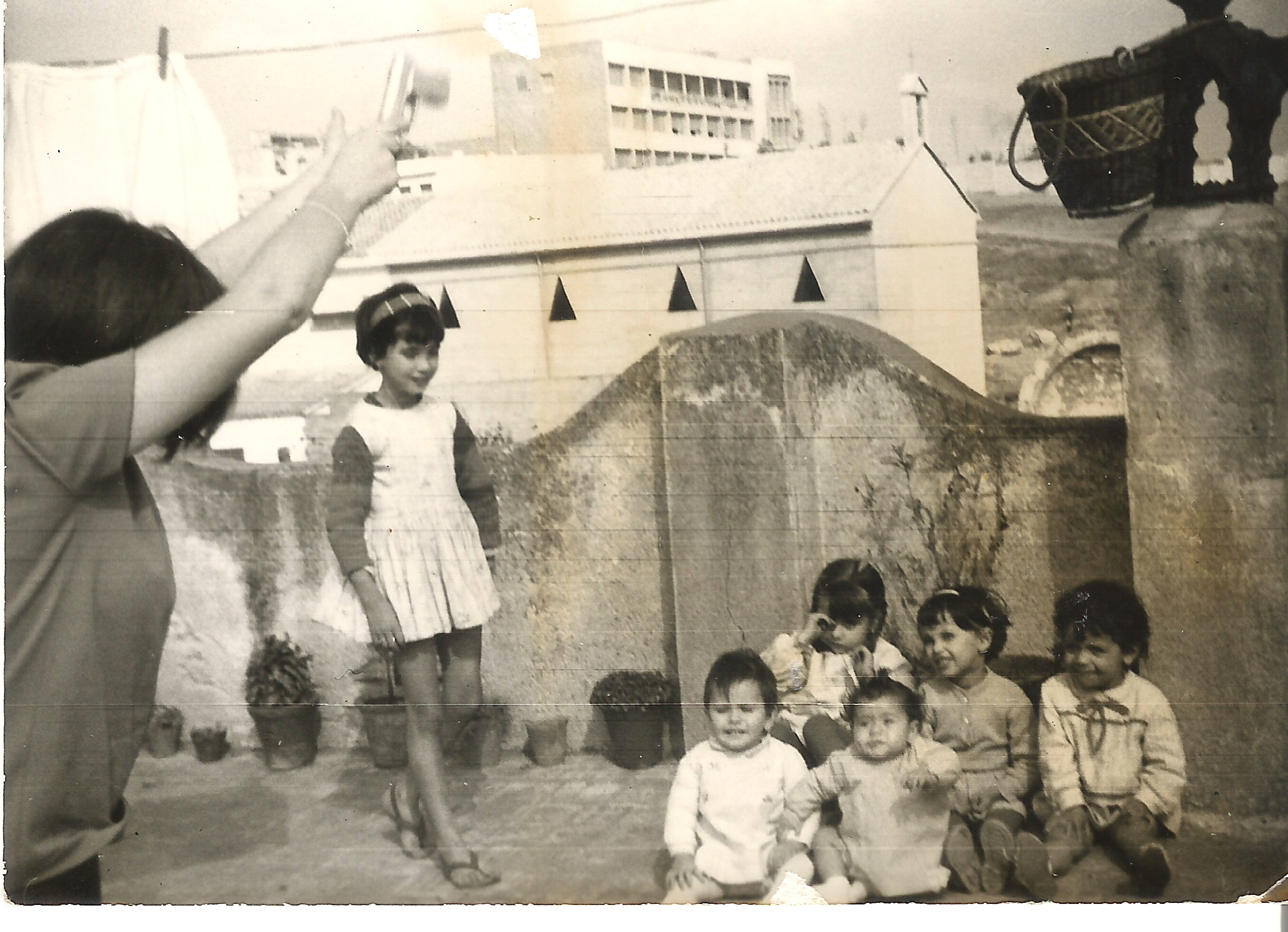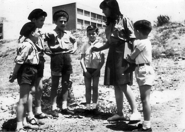 Grup d'escoltes "Boy Scouts" de la parròquia de Sant Antoni de Llefià. Fotografia presa en l'actual ronda de Sant Antoni, el nen de la dreta és Josep Valero, la monitora Rosi anomenada pel grup "Akela", el nen del centre és Juan Carlos Rodríguez. Al fons col·legi Maria Ward.
