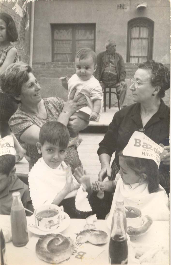 Xocolatada al carrer Mare de Déu de Lorda durant la Festa Major de Sant Antoni. A primer terme els germans Josep i Gisela Valero Bertrán. Darrere d'esquerra a dreta Sra. Magdalena Ibáñez, Mónica Andreu (néta de la Sra. Magdalena), Vicenta Royo. Any 1964.
