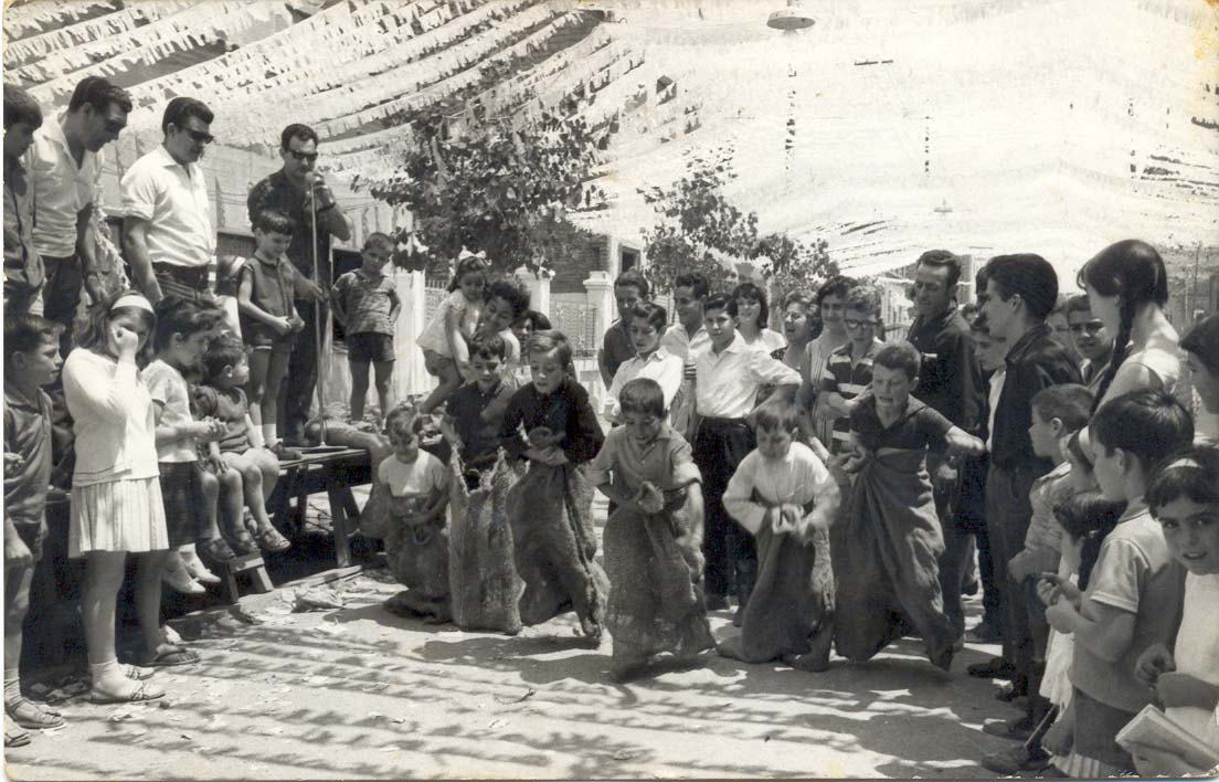 Cursa de sacs celebrada al carrer de la Mare de Déu de Lorda durant la Festa Major de Sant Antoni. Any 1964.