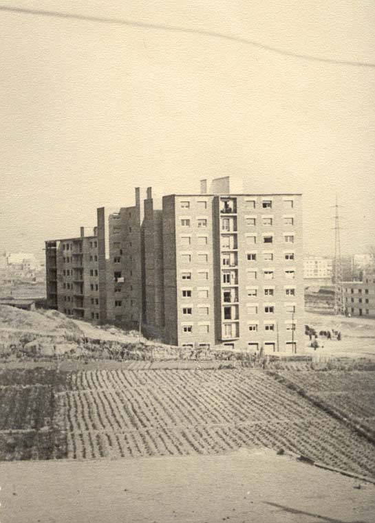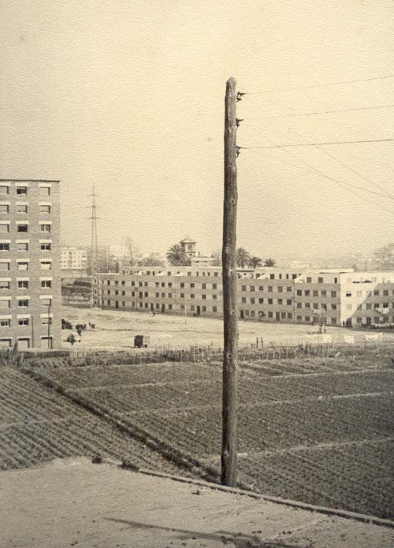 Vista general de Llefià. Fons: Francisco Martínez Data: 21/06/05 Vista des del final del carrer Mare de Déu de Pompeia, on s'aprecien els actuals carrers Salou, i av. Marquès de Sant Mori; i a primer terme l'actual plaça de l'Amistat.