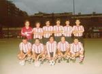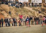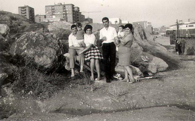 Fotografia datada el 19/10/1971. Foto feta per sobre del camp de futbol on actualment es troba l'IES Júlia Minguell, a la dreta podem veure part del mur superior del camp de futbol i al fons els blocs de la ronda Sant Antoni, en el centre la família Aroca i la família Egea.