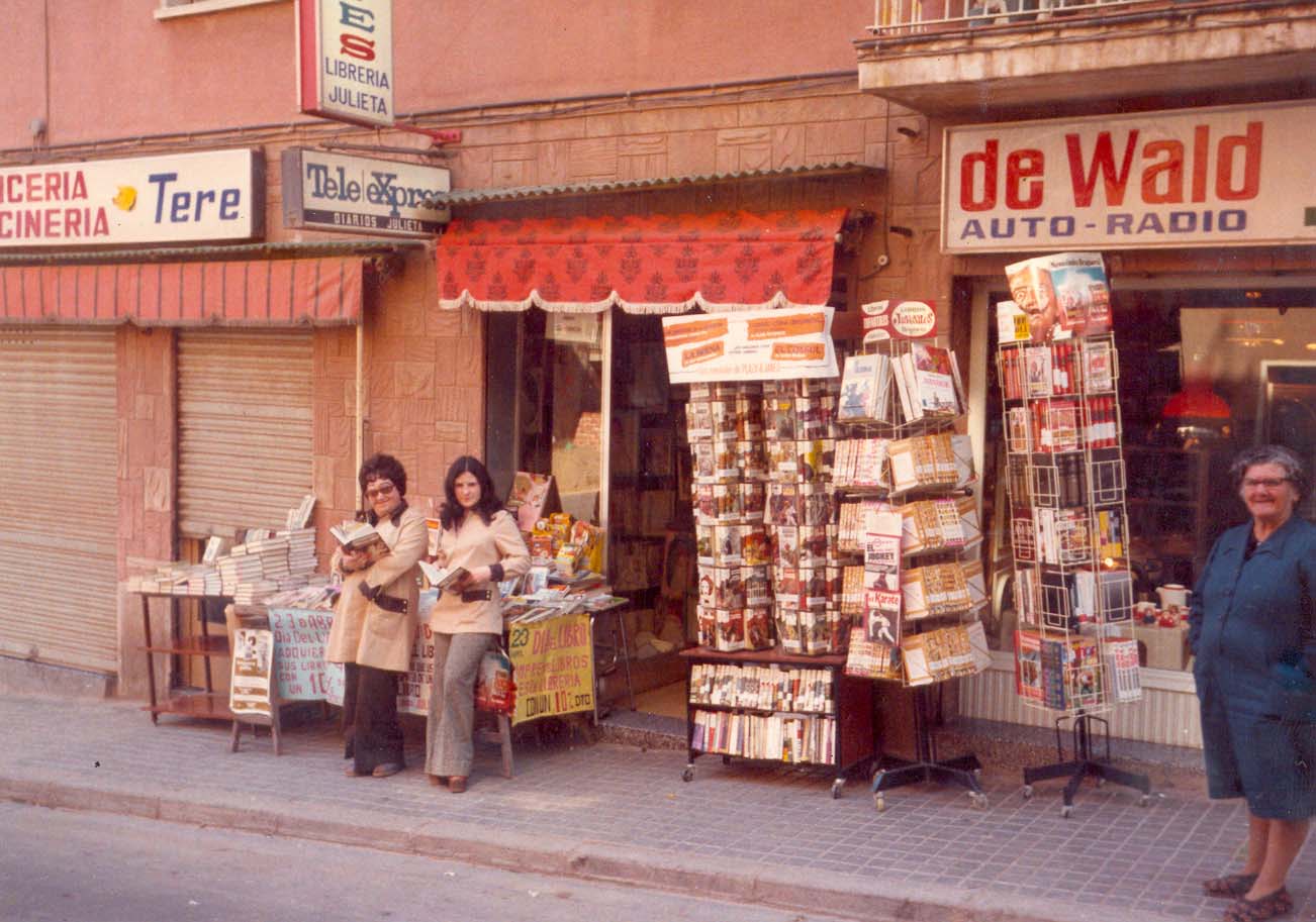 1975. Llibreria Julieta. Fons: Encarna Mejías Data: 21/06/05 Fotografia presa el 23 d'abril de 1975. Llibreria situada al carrer Pérez Galdós. A l'esquerra, Sra. Julieta, i al costat, Encarna Mejías. A la dreta, Sra. María Iglesias.