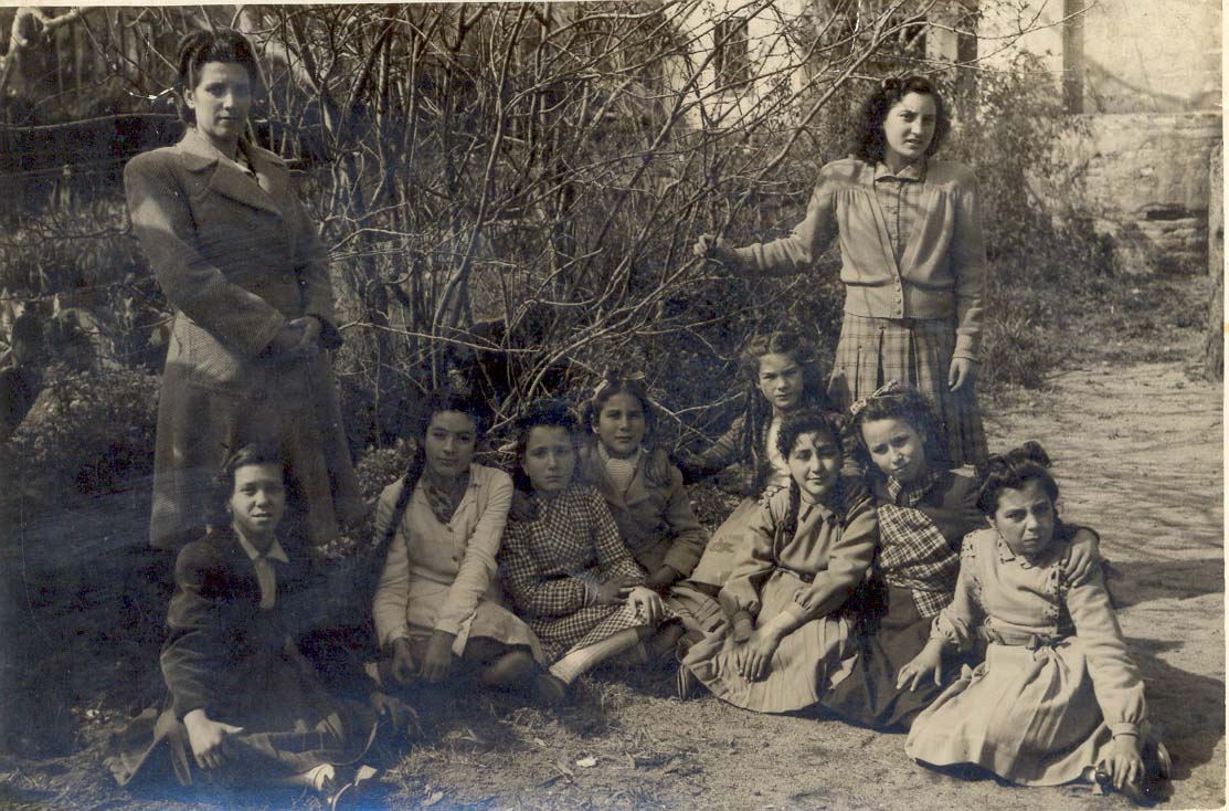 Dretes d'esquerra a dreta: la mestra senyoreta. Paquita i Pilar. Assegudes al terra (també d'esquerra a dreta): Ana Mª, Damiana, María Sanso, Rosalia Sadurní, Juana Vidal, Teresa Bertrán, Angelina Sambernardo i Carmen Vidal.