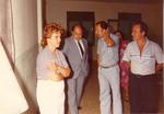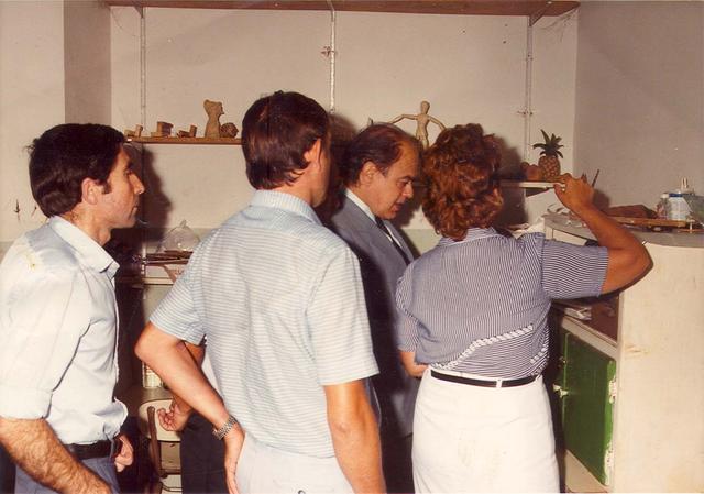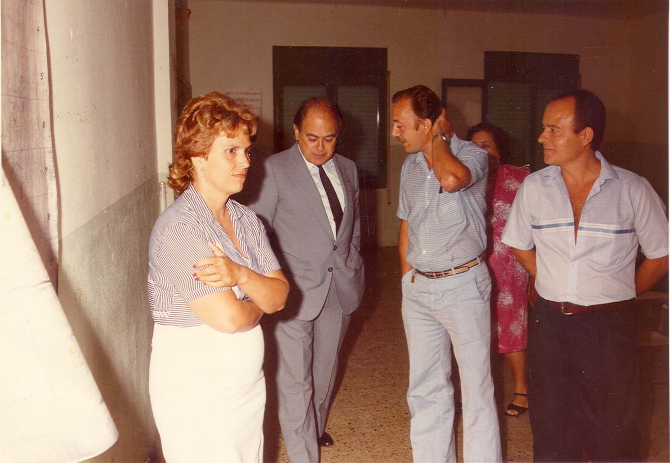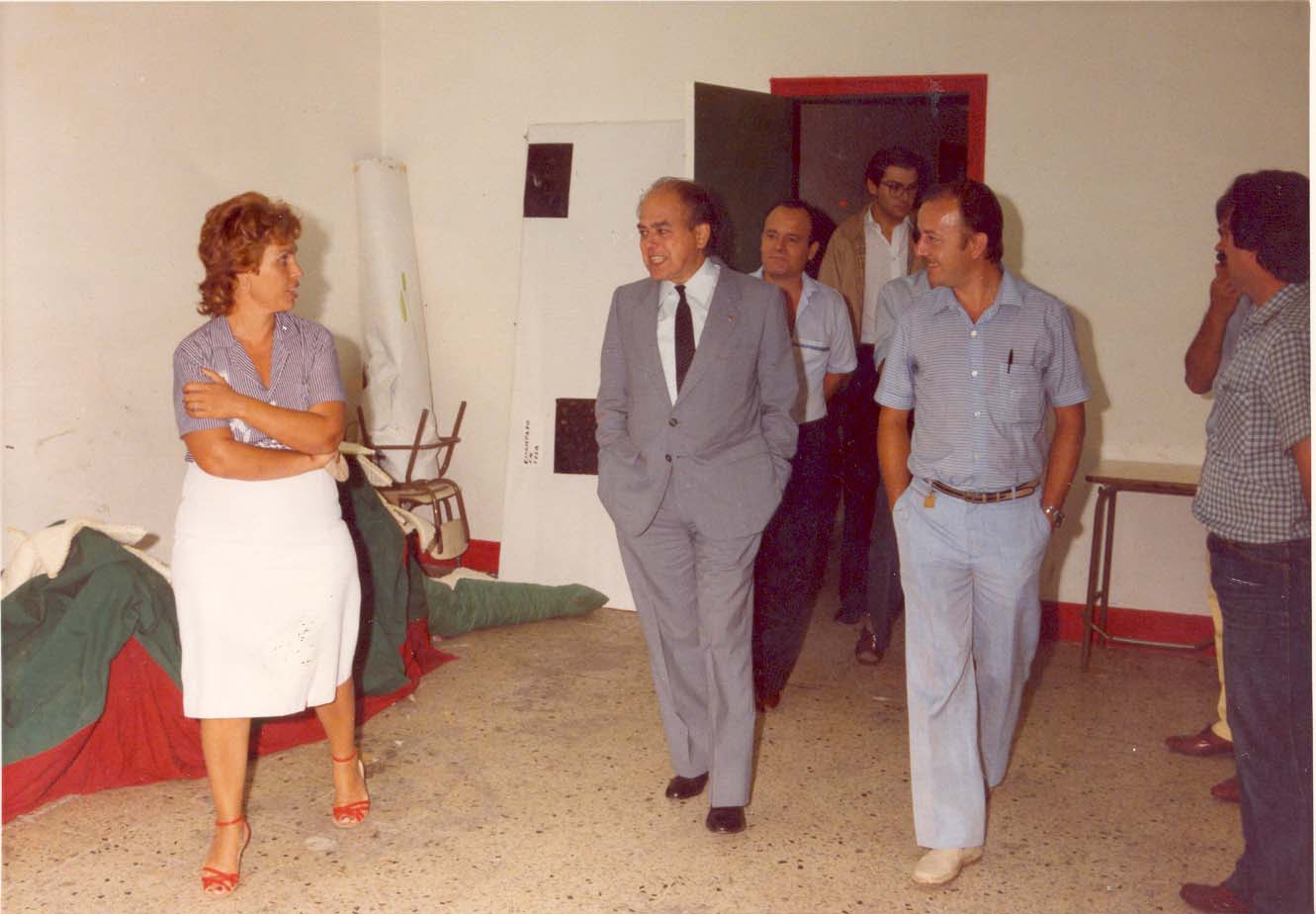 Any 1985. Visita del Molt Honorable President de la Generalitat a l'AV Sant Antoni. A la fotografia els locals del Cercle Artístic a l'Escola d'Adults situada al carrer d'Europa. A l'esquerra, la Teresa; el president; Antonio Agudo (Julio), president de l'AV Sant Antoni i Antonio Puente.