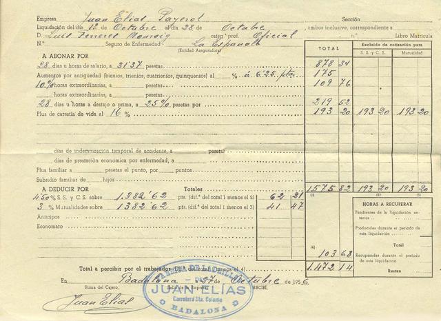 Nòmina de Lluís Ferreres Montroig, treballador de la bòbila de Joan Elias
